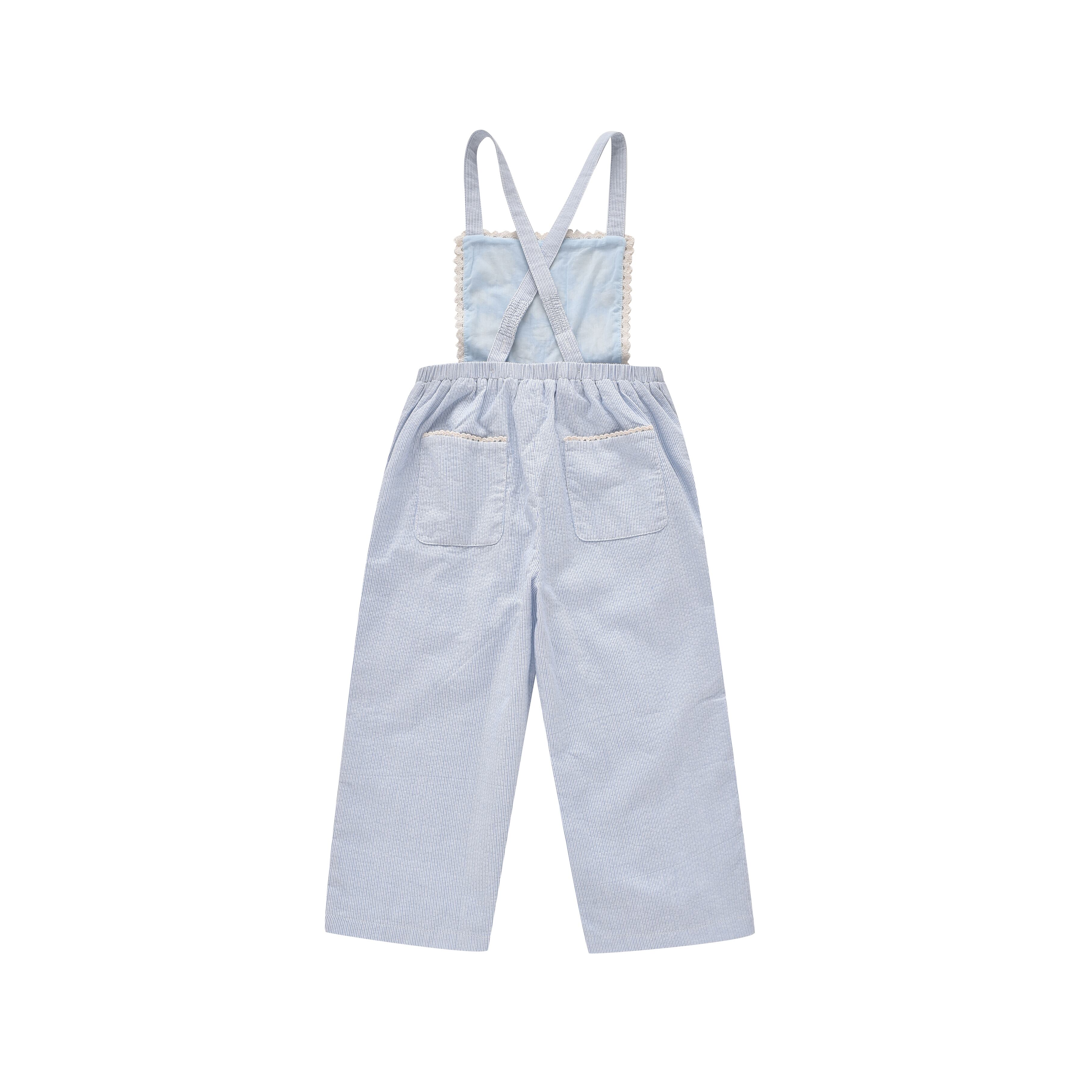 ブルーストライプのコットンオーバーオール。
